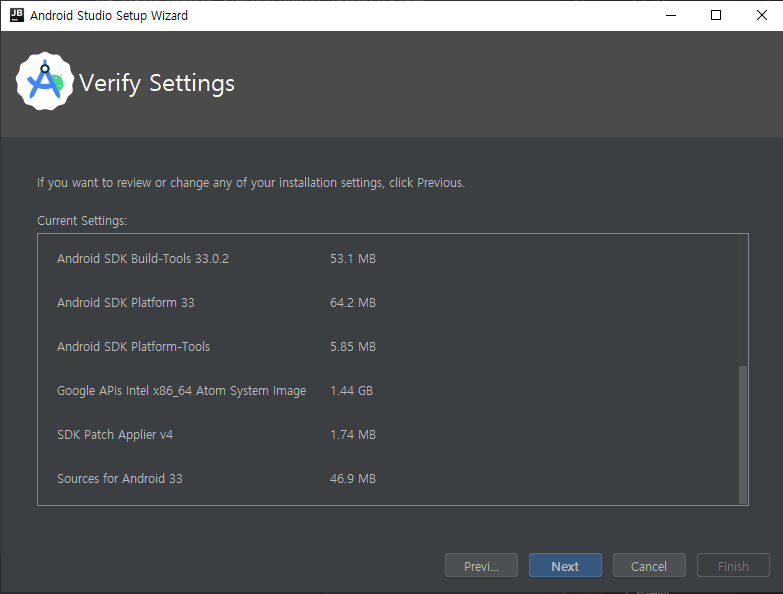 AVD(Android Virtual Device, 안드로이드 가상 디바이스)는 나중에 설치할 수도 있으니 지금 설치할 필요는 없다.