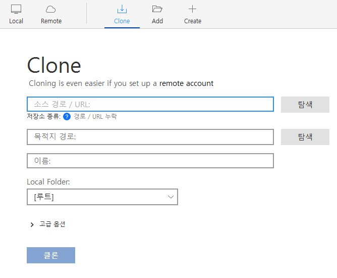 Clone을 선택하고 자신의 프로젝트 github url을 적어주면 알아서 local에 설치할 경로를 잡아줍니다.