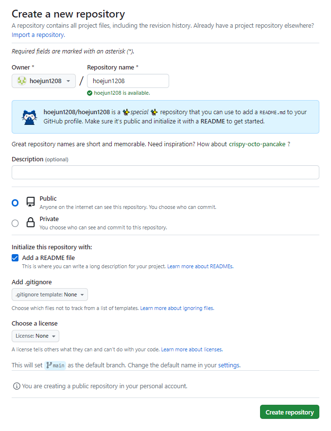 이제 Add a README file을 체크해서 README를 만들면서 repository를 생성하면 된다.