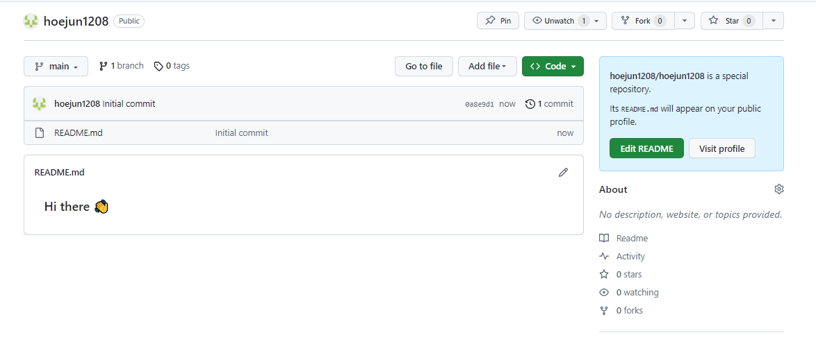 그러면 repository가 정상적으로 생성되면서 기본 프로젝트와는 다르게 생긴 README파일이 생긴 모습을 볼 수 있을 것이다.