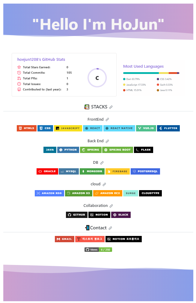 필자는 위에 것들을 이용하여 아래와 같이 깃허브를 꾸몄다.