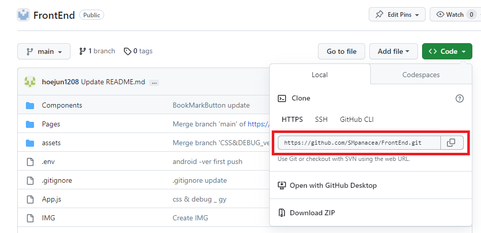 그리고 팀프로젝트의 주소를 복사하고 git bash에 아래 내용을 작성한다