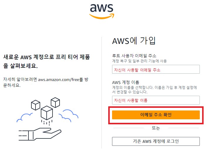 자신이 사용할 이메일과 이름을 적고 이메일 주소 확인 버튼을 클릭한다.
