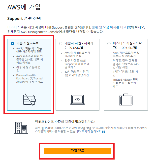 기본지원 무료를 선택하고 가입완료를 클릭한다.