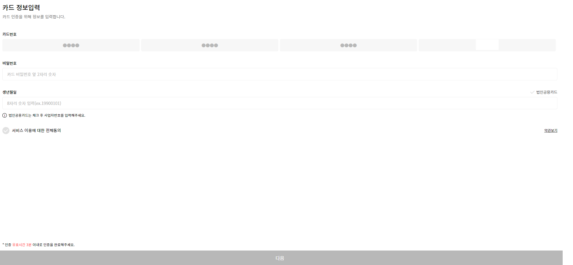 카드정보를 마저 입력후 다음을 누른다.